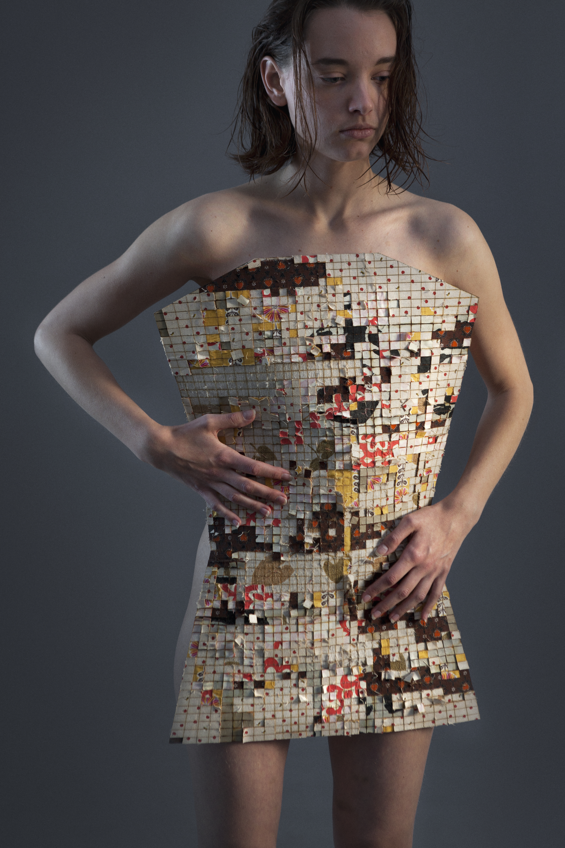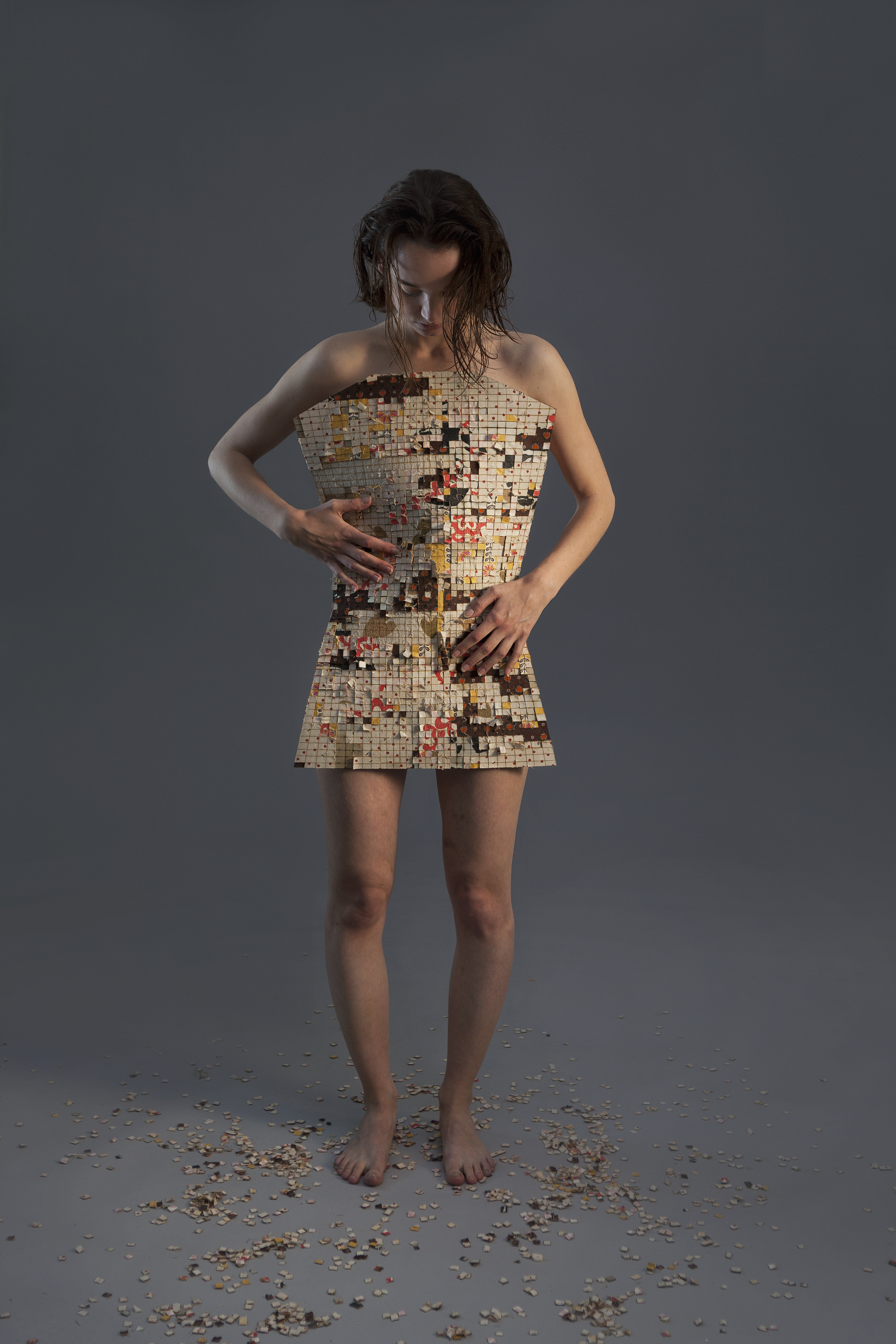Textiles are emblematic for the trend-driven affluent society. As these wearables are falling apart, they are telling a story about passed trends, exposing patterns and materialities in their layers that have long been out of fashion. The objects communicate an obsolescence, transparently. They do not hide their own fragility, which in some sense makes them honest objects. From the heavy mass of overproduction, objects have been created, which in this work are confronted with the human body.